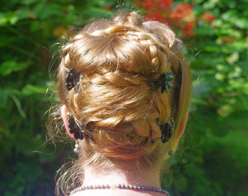 My updo for today looked like horizontal lines, so I'll call it my "horizon bun." I made the mohawk Dutch braid and side English braids first, then put my hair in a high ponytail. I clipped the bottom of my ponytail to the back of my head, and wrapped the rest of my hair around the clip and the ponytail base. It had a layered look when I was done. Thank you for following my blog! I'm excited to see us slowly getting closer to 300,000 pageviews!